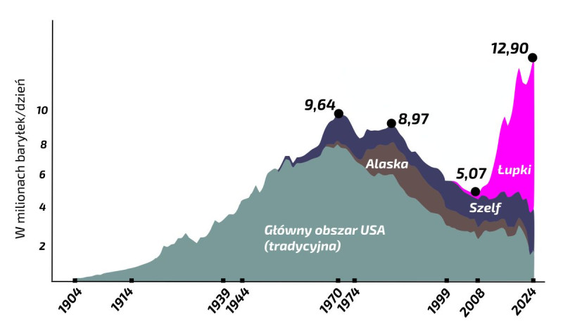 Wykres obrazujący wydobycie ropy w USA. Gwałtowny jego wzrost w ciągu ostatnich 20 lat pozwolił Waszyngtonowi utrzymać się w pozycji głównego nadzorcy i zawiadowcy światowego rynku ropy. Ale cały ten przyrost wydobycia wynika nie z odkrywania tradycyjnych złóż, a z eksploatacji łupków. Złoża łupkowe mają przy tym tę cechę, że mają bardzo dużą wydajność na początku eksploatacji (inwestorzy przyciągani są szybkością zwrotu nakładów). Wadą tego mechanizmu jest to, że tego typu złoża "nagle" w bardzo szybki sposób się kończą. Może być więc tak (będzie tak na pewno), że łupki nagle zaczną się wyczerpywać, a złoża tradycyjne będą katastrofalnie niedoinwestowane. (Źródło: str. 215, rozdział pt. "Światowy system dystrybucji energii").